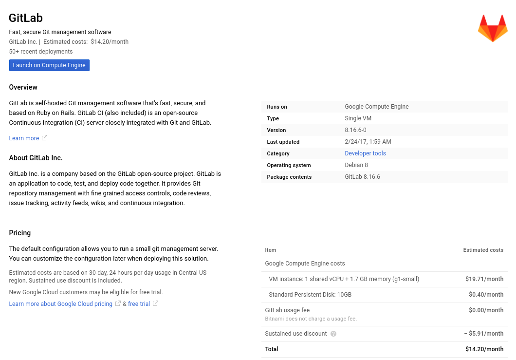 3. In the next page, you can see an overview of the GitLab VM as well as some estimated costs. Click the Launch on Compute Engine button to choose the hardware and network settings.